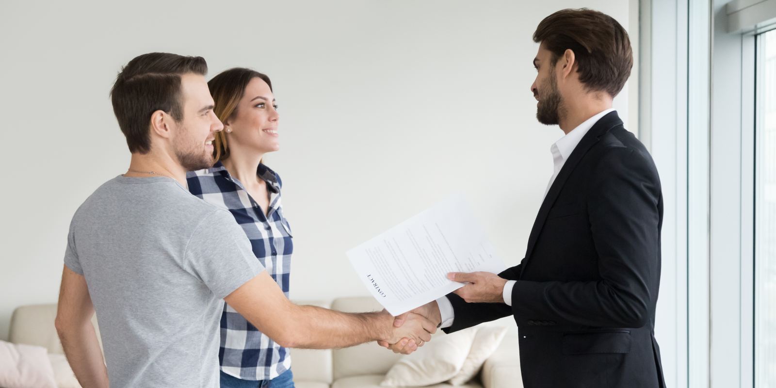 Woman Handing Over Key to Tenant with Holding Home Insurance Policy Form